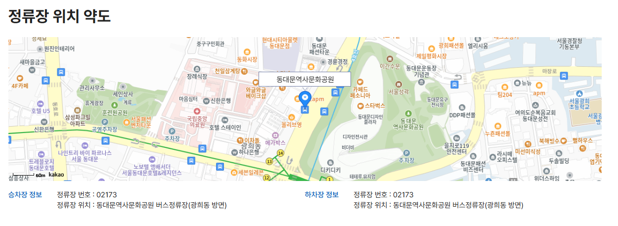 - 정류장 명칭: 동대문역사문화공원역 더스프라지르 호텔 앞