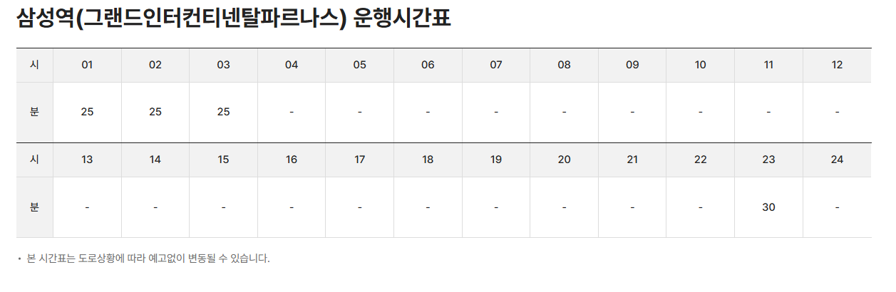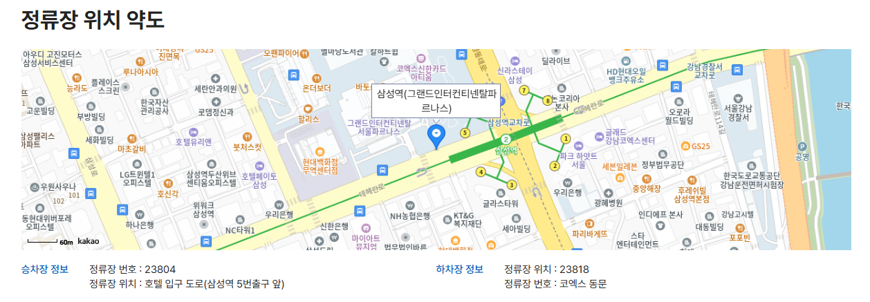 - 정류장 명칭: 삼성역 그랜드인터컨티넨탈 서울 파르나스 앞