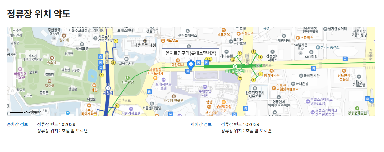 - 정류장 명칭: 을지로입구역(롯데호텔서울)