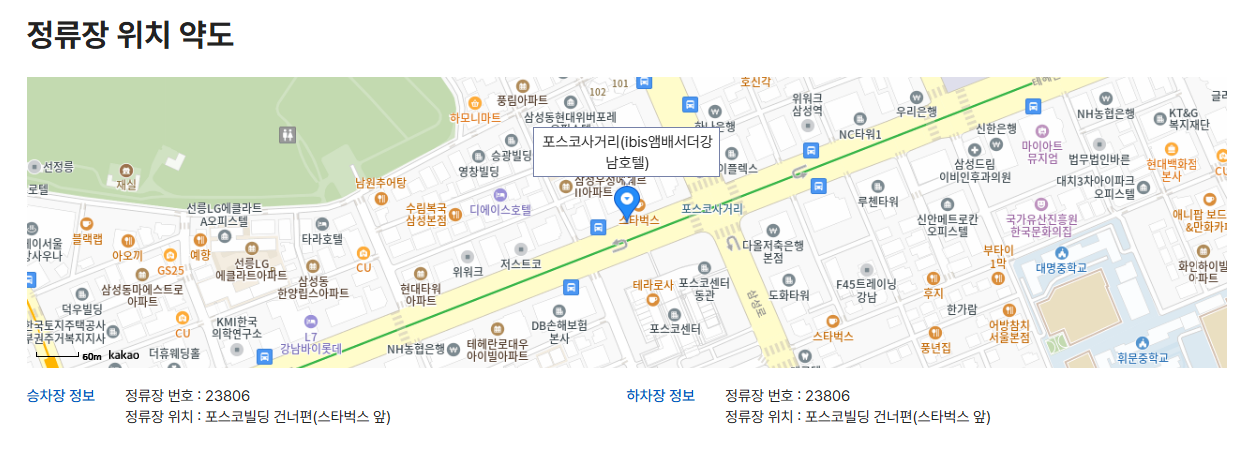 - 정류장 명칭: 포스코사거리 (아이비스 앰배서더 강남 호텔 앞)